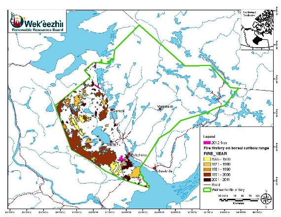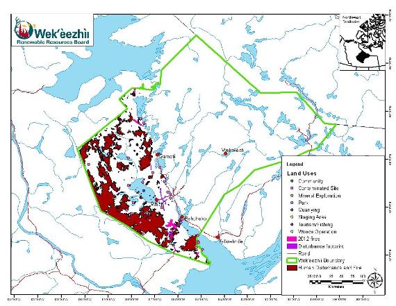 The scientific data collected showed that overall, an estimated 33.4% of tǫdzı (boreal caribou) habitat within Wek’èezhı̀ı has been disturbed, either by forest fires or by human activity. Forest fires account for most of that disturbance—32.8% of the tǫdzı’s habitat has been disturbed by fire within the last 40 years. Based on a previous analysis (2011), there is relatively little disturbance resulting from human activity—less than 1%. However, updated data showing the spatial extent of human induced disturbance was not available for 2012.