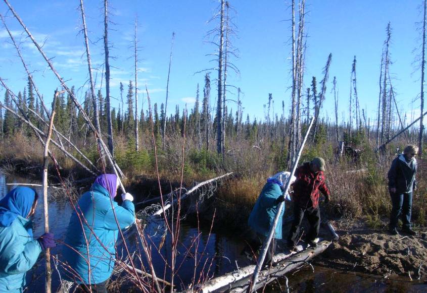 The research team, working with consultant Allice Legat and Rita Wetrade, Tłı̨chǫ Knowledge Coordinator, Tłı̨chǫ Government, spent seven days on the land last September 24-30, 2012. They looked for signs of tǫdzı and other wildlife and examined vegetation to determine the health of berry bushes, lichen, trees and grasses.