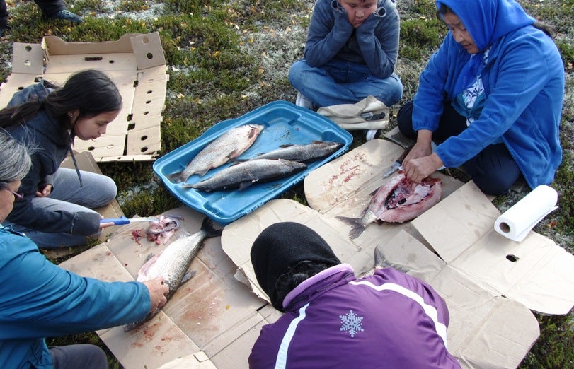 Take a look at a map of the Tłįcho (Tlicho) region and you'll see a lot of blue. The rolling Canadian Shield country that is characteristic of the area holds countless lakes and rivers. Tłįcho have travelled these routes and fished these waters for generations. The waters and fish that inhabit them are a precious resource--one that Tłįcho communities want to keep watch over to make sure the fish are healthy and the water is clean.