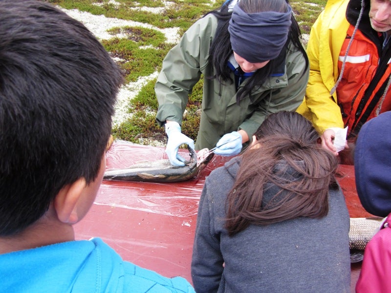 Biologists at the camp demonstrated how to determine the age and health of fish using scientific measures. They measured the length of each fish and weighed it. To figure out the fish’s age, they extracted a piece of bone called the otolith from behind the fish’s head. In much the same way a doctor will often look at a patient’s eyes as part of his or her assessment, biologists described the eyes and general appearance of the fish. Finally, they showed participants how to take a muscle sample to send out to a lab in Vancouver to analyze the tissue for metals.