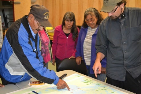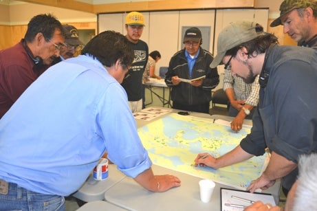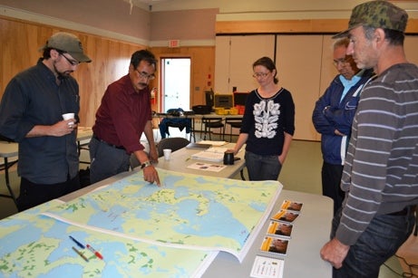 Earlier in June, community members decided to focus the sampling on two fish species that are especially important food sources: Lake Whitefish and Lake Trout. At our August meeting, community members gathered around the map produced in June and further discussed camp and sampling locations. They decided where to set up the monitoring camp and identified a number of good places for setting nets and taking water and sediment samples –based on such factors as water levels at this time of year, where water for tea is taken, and available shelter for boats.