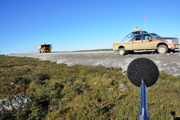 What is the size of a mine development’s footprint? Several studies have estimated the size of the ZOI of mining operations in the Bathurst caribou summer range. One study based on caribou data estimated the ZOI at 14 km. Other studies have estimated the ZOI at about 1 – 5 km. What causes the ZOI? Observations by community members and researchers suggest that there are environmental changes –disturbances—related to mining activities that are suspected to play a key role. Knowing the causes is important because that can help find ways to reduce the size of the ZOI—and help researchers better understand why caribou avoid these areas. The first step in understanding the causes of the ZOI is to be able to measure these disturbances and their reach. How far away can caribou potentially hear the activities from a mine? How likely is a caribou to see a vehicle driving on a mining road at varying distances away?