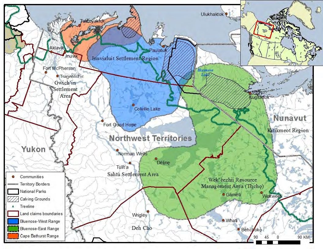 The Bluenose Caribou herds are an important shared resource for the Inuvialuit, Gwich’in, Sahtú, Tłı̨chǫ and Deh Cho regions of the NWT and the Kitikmeot Region of Nunavut. Occupying a large part of northern mainland NWT and western Nunavut, the herds are shared among many communities who depend on the long-term sustainability of the herds and their habitat. The map in the Photo Gallery at the end of the story shows the ranges and calving grounds of the Cape Bathurst, Bluenose-West and Bluenose-East caribou herds.