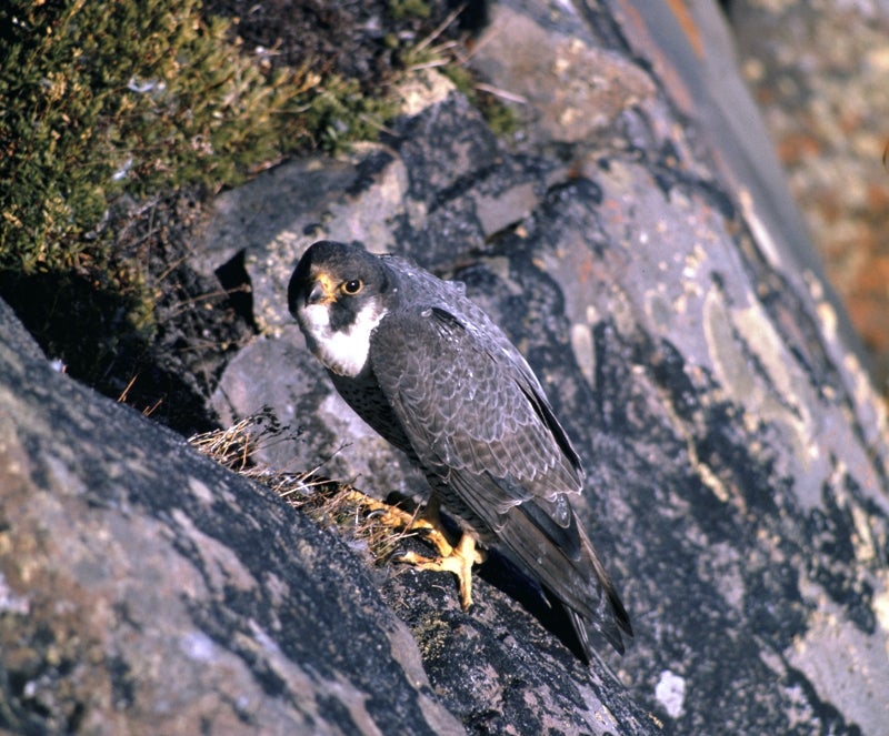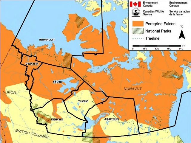 The map in the Photo Gallery at the end of this article shows the Peregrine Falcon's range in the NWT. These birds arrive at their breeding areas in the North, including the northern and northeastern part of Wek’èezhìı, in May. In October, they leave for their wintering grounds in southern Canada and into South America.