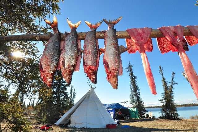 Dry fish preparation at fish camp. Photo: Paul Vecsei, Golder Associates Ltd.