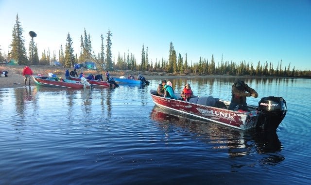 Former WRRB Board Chair Joseph Judas and Board member Jonas Lafferty setting off by boat (Photo: Paul Vecsei, Golder Associates Ltd.)