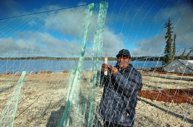 Elder Charlie Football demonstrating how to mend a net. Photo: Paul Vecsei, Golder Associates Ltd.