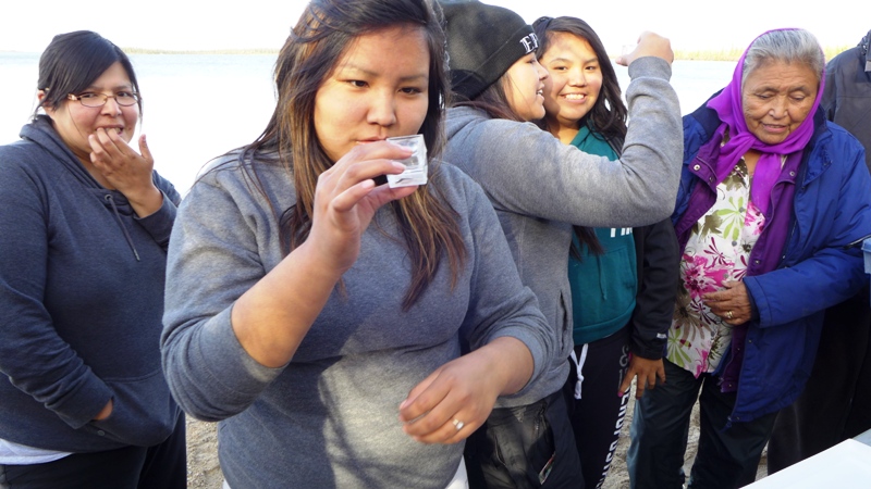 The TAEMP team would like to thank the community of Whatì and all the participants for a successful and rewarding camp. Elders shared their knowledge and stories, and the youth helped out at camp and learned from the elders and support staff. Everyone enjoyed the traditional food prepared by the camp cooks, especially the fish fillets. On the last evening there was laughter and good spirits in the meeting tent during the hand games demonstration and drum dancing. The next morning, after feeding the fire and packing up their things, everyone returned home safely.