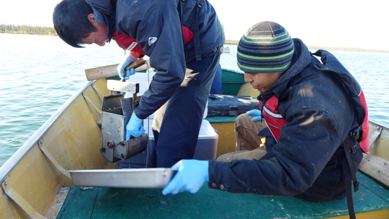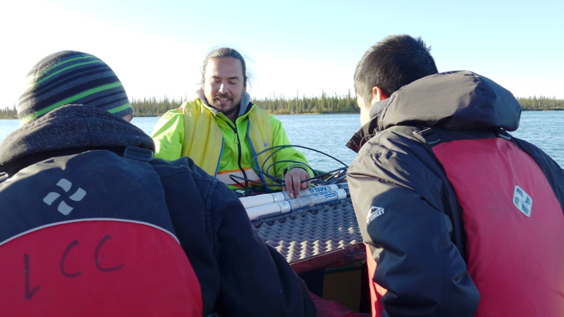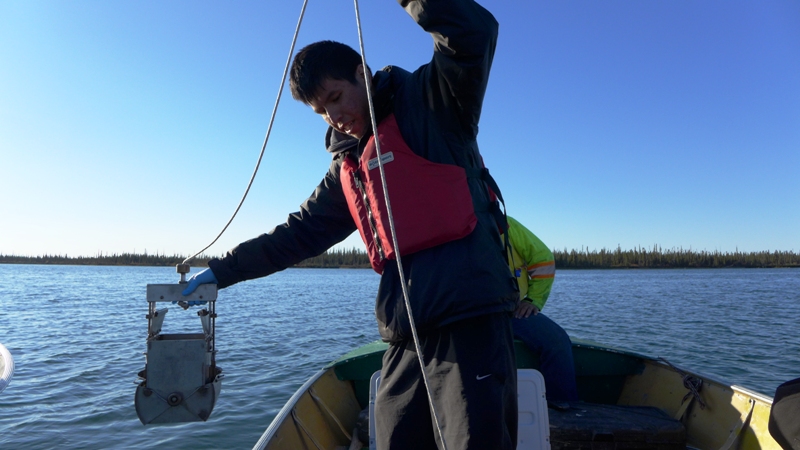 On the first day of water and sediment sampling out in the boats, Sean Richardson, Wildlife Coordinator for the Tłįcho Government’s Culture and Lands Protection Department, and Roberta Judas from the Wek’èezhìı Land and Water Board, showed the youth how to use water sampling equipment to help determine the amount of solid matter suspended in the water and how “cloudy” it was, the dissolved oxygen, how acidic the water was, the levels of nutrients and various metals, and water temperature. Each of these measures has a story to tell. For example, water temperature is important for the health and survival of aquatic life. Changes in the temperature can affect reproduction and growth.