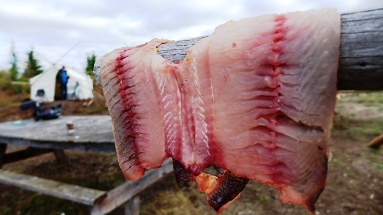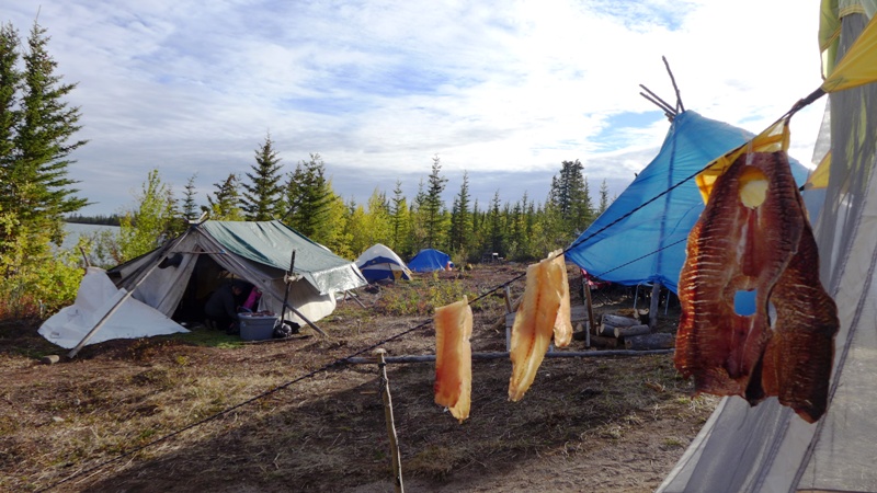 Being wind-bound provided a good opportunity for taking part in learning activities right in camp. Fish biologist Paul Vecsei, Golder Associates, demonstrated how to process a fish for sampling and how to obtain the required information from the fish. Assisted by Francois Larouche, DFO, Paul measured each sample fish’s length, girth, and weight, recorded its sex, and observed the general appearance of the fish. Tissue samples were collected, with the samples examined by a lab after the camp in order to determine the levels of various contaminants in the fish collected at the camp. To determine the fish’s age, Paul extracted a tiny bone from the head, the otolith, because it has rings that can be counted, similar to counting the annual growth rings in a tree. Paul also pointed out the differences among the fish species caught in the fish nets, and the characteristics that make each best adapted for the lifestyle they live, the way they hunt, and the places they live in. Pike, for example, are solitary ambush predators that move so fast the human eye can’t even follow them! Once fish were pulled from the net and samples taken, fish fillets were delivered to the cooking tent for supper—or hung over the fire for dry fish.