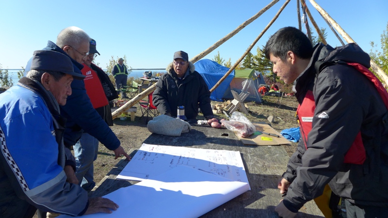 From September 8-12, 2014 elders, youth, and support staff from Whatì joined fish biologists, water monitoring specialists and WRRB staff at a five-day on-the-land camp on Burnt Island, about 14 km west of the community. The camp location was a great place for learning and sharing traditional Tłįcho and scientific information and observations about the area’s aquatic environment. Elders spoke about how important Lac la Martre is in providing for the community’s fishing needs –as well as the needs of others. Community members showed where to set nets to catch the 20 Lake Whitefish and 20 Lake Trout required for sampling, and recommended where to take water and sediment samples. They advised that water levels in Lac la Martre were low this year, and elders and boats captains helped navigate the boats safely through the rocks and shoals in the shallow water.