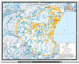 The following link shows animations of annual Bathurst caribou herd movements, which were presented by ENR to the WRRB during its February 23-24, 2016 public hearing: http://www.caslys.ca/WRRB_CaribouAnimations/main.html. |