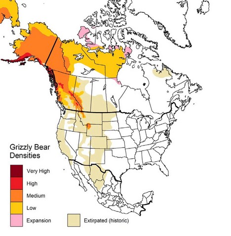 Map showing historic and current range of grizzly bears in North America. Population densities, a measure of the number of grizzly bears per unit of area, are also shown. Note that in most of the NWT, grizzly bears are considered low density, meaning their numbers are relatively small and spread out over a large area. Source: COSEWIC Status and Assessment Report - Grizzly Bear (2013)