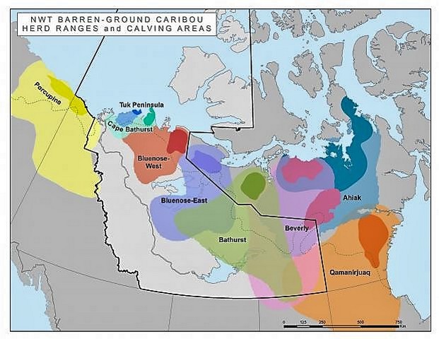NWT Barren-ground caribou herd range and calving areas. Calving areas are indicated by the darker areas within ranges. Map: GNWT / ENR