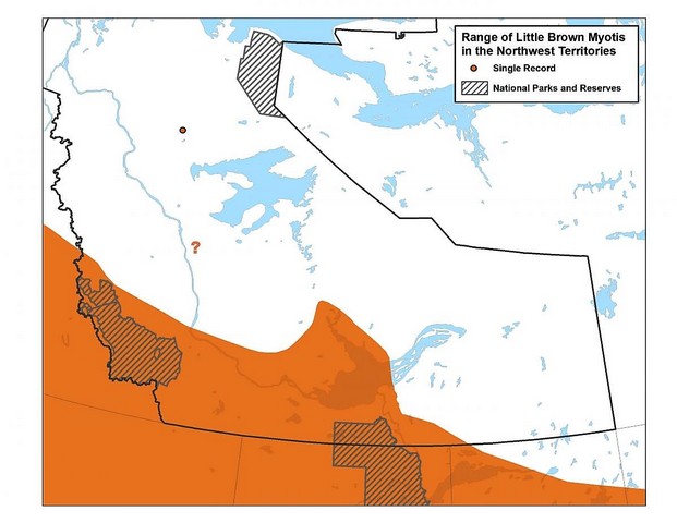 Range of little brown myotis in the NWT. The northern limit of its range is not well known, but a little brown myotis was found in Colville Lake in 2012. Source: GNWT / NWT Species at Risk